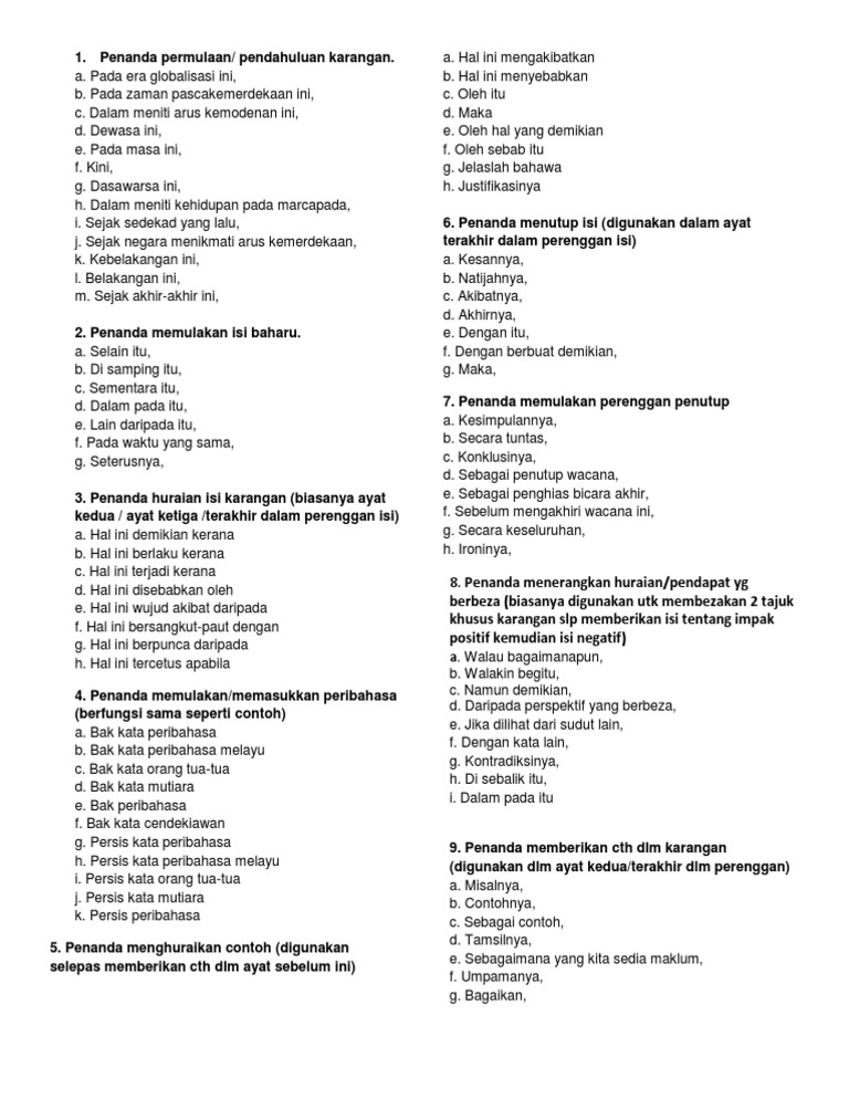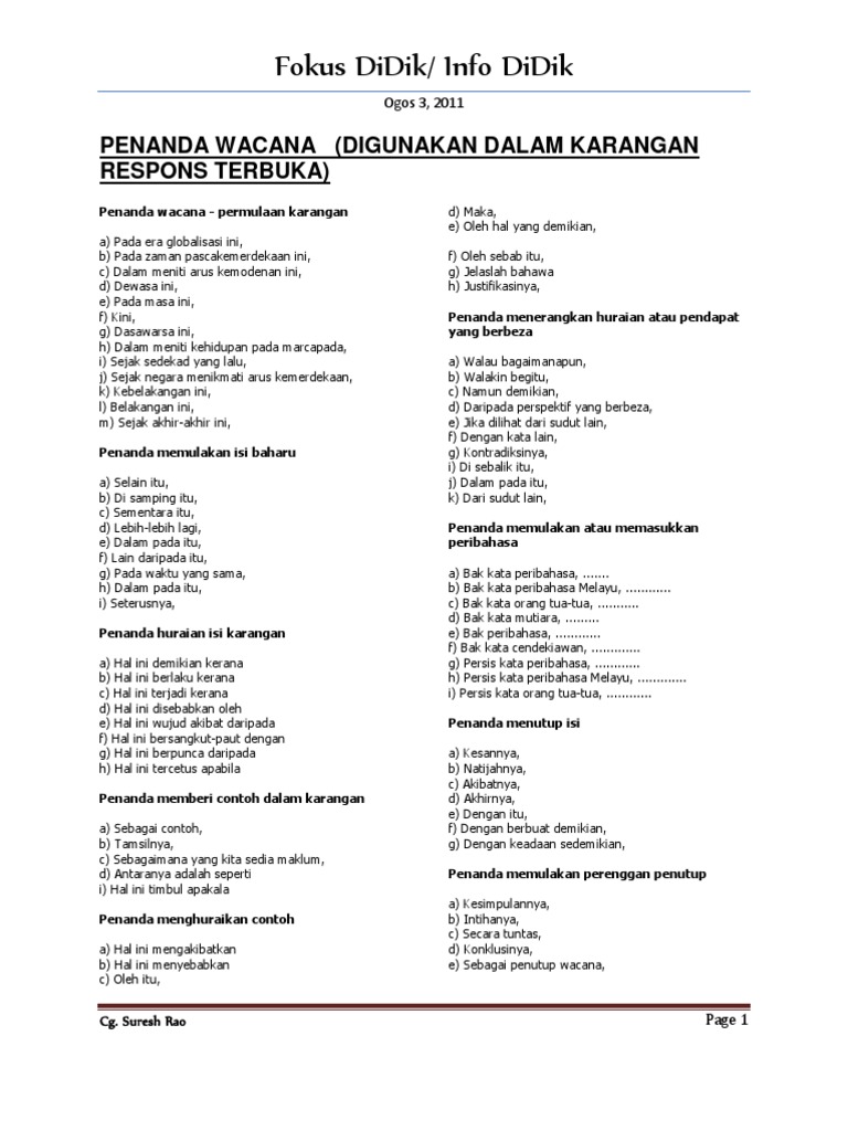PENANDA WACANA UNTUK MENYATAKAN CONTOH Sebagai contohnya Biar kita lihat Biar kita ambil contoh Bagi membuktikan perkara ini contoh yang boleh diketengahkan ialah Sebagai analoginya Contoh yang ketara yang paling dekat dengan kita ialah PENANDA WACANA UNTUK KESIMPULAN KARANGAN Intihanya Sebagai menggulung segala yang. Anda digalakkan supaya menggunakan ayat anda sendiri tanpa mengubah maksud asal petikan. Hal ini mengakibatkan 2.